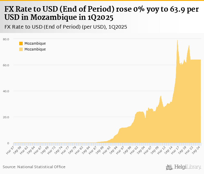 FX rate to USD at the end of period rose 0% yoy to 63.9 per USD in Mozambique in 1Q2025, according to the National Statistical Office. This is 0.016% less than in the previous quarter.