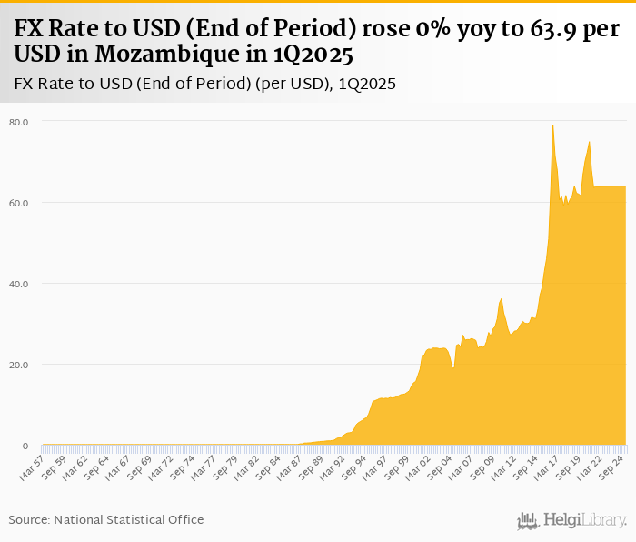 FX rate to USD at the end of period rose 0% yoy to 63.9 per USD in Mozambique in 1Q2025, according to the National Statistical Office. This is 0.016% less than in the previous quarter.