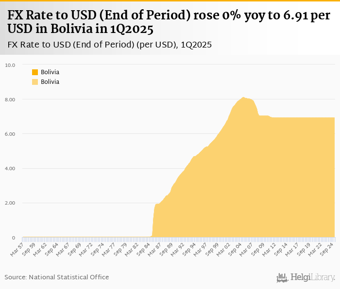 FX rate to USD at the end of period rose 0% yoy to 6.91 per USD in Bolivia in 1Q2025, according to the National Statistical Office. This is 0% more than in the previous quarter.
