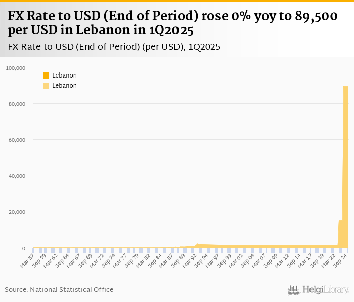 FX rate to USD at the end of period rose 0% yoy to 89,500 per USD in Lebanon in 1Q2025, according to the National Statistical Office. This is 0% more than in the previous quarter.