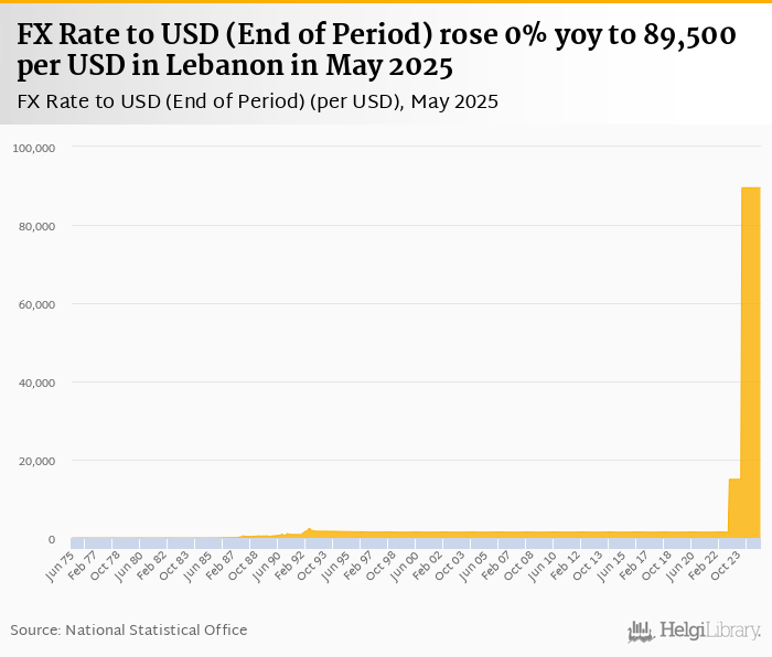 Historically, FX rate to USD at the end of period in Lebanon reached an all time high of 89,500 per USD in May 2025 and an all time low of 2.22 per USD in June 1975.