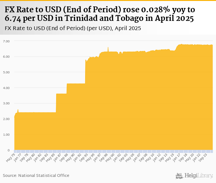 FX Rate to USD (End of Period) rose 0.028% yoy to 6.74 per USD in Trinidad and Tobago in April 2025