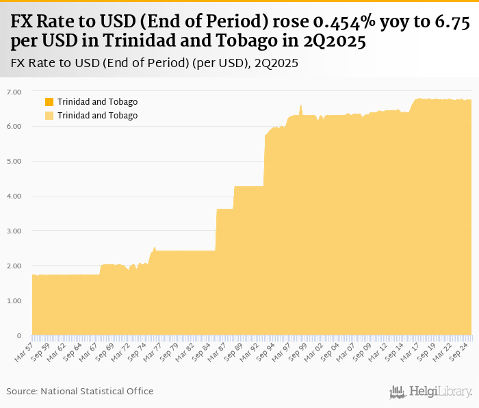 FX Rate to USD (End of Period) rose 0.454% yoy to 6.75 per USD in Trinidad and Tobago in 2Q2025