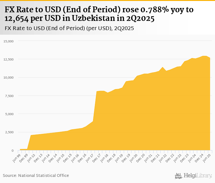 FX rate to USD at the end of period rose 0.788% yoy to 12,654 per USD in Uzbekistan in 2Q2025, according to the National Statistical Office. This is 2.01% less than in the previous quarter.