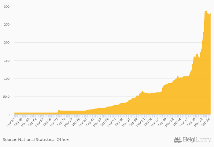 FX rate to USD at the end of period rose 0.801% yoy to 280 per USD in Pakistan in 1Q2025, according to the National Statistical Office. This is 0.576% more than in the previous quarter.