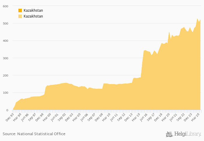 FX rate to USD at the end of period rose 10.2% yoy to 520 per USD in Kazakhstan in 2Q2025, according to the National Statistical Office. This is 3.01% more than in the previous quarter.