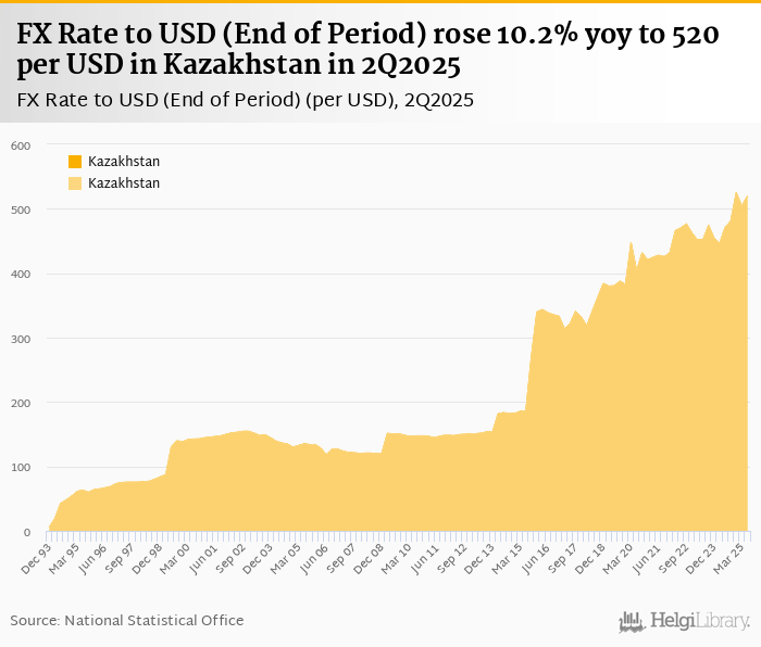 FX Rate to USD (End of Period) rose 10.2% yoy to 520 per USD in Kazakhstan in 2Q2025
