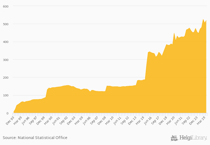 FX rate to USD at the end of period rose 10.2% yoy to 520 per USD in Kazakhstan in 2Q2025, according to the National Statistical Office. This is 3.01% more than in the previous quarter.