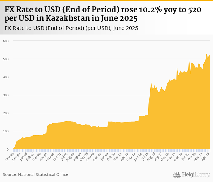 FX rate to USD at the end of period rose 10.2% yoy to 520 per USD in Kazakhstan in June 2025, according to the National Statistical Office. This is 1.73% more than in the previous month.