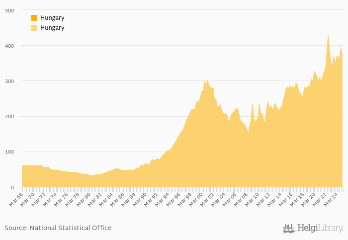 Historically, FX rate to USD at the end of period in Hungary reached an all time high of 429 per USD in 3Q2022 and an all time low of 31.9 per USD in 1Q1980.