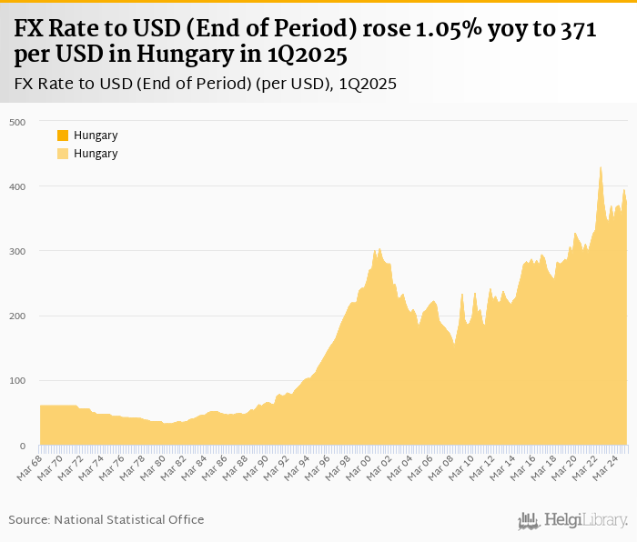 FX rate to USD at the end of period rose 1.05% yoy to 371 per USD in Hungary in 1Q2025, according to the National Statistical Office. This is 5.70% less than in the previous quarter.