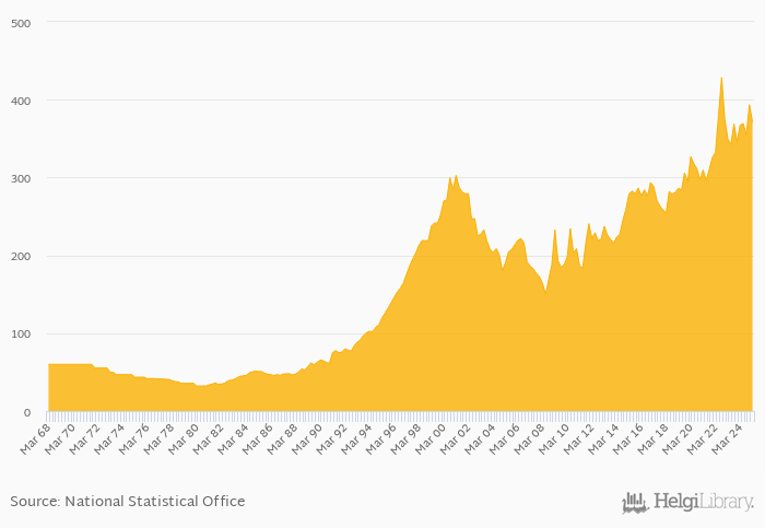 FX rate to USD at the end of period rose 1.05% yoy to 371 per USD in Hungary in 1Q2025, according to the National Statistical Office. This is 5.70% less than in the previous quarter.