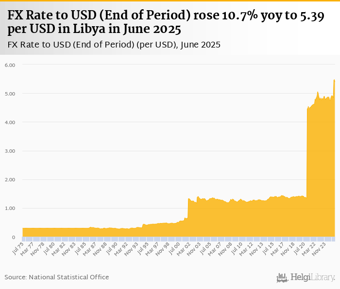 FX rate to USD at the end of period rose 10.7% yoy to 5.39 per USD in Libya in June 2025, according to the National Statistical Office. This is 1.51% less than in the previous month.