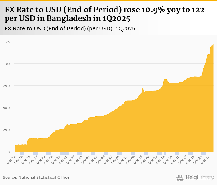 FX rate to USD at the end of period rose 10.9% yoy to 122 per USD in Bangladesh in 1Q2025, according to the National Statistical Office. This is 1.67% more than in the previous quarter.