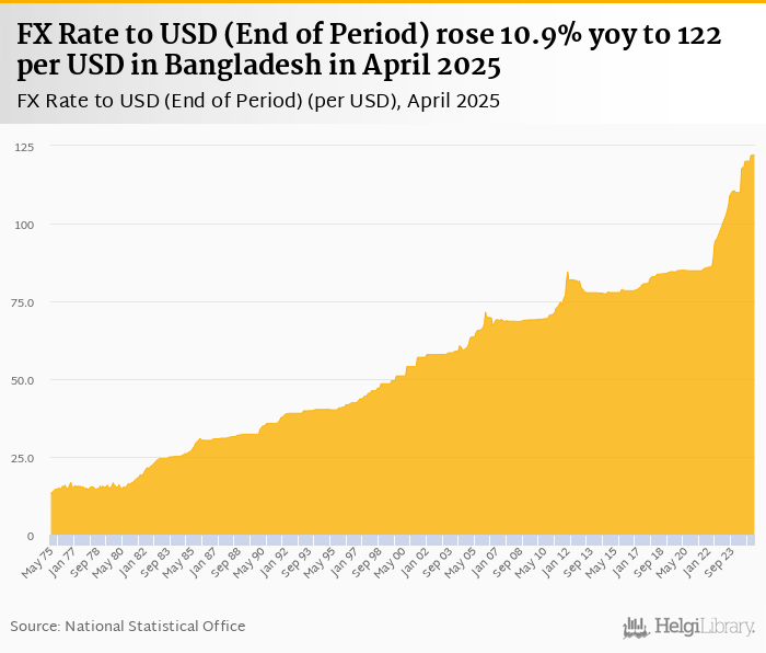 FX rate to USD at the end of period rose 10.9% yoy to 122 per USD in Bangladesh in April 2025, according to the National Statistical Office. This is 0% more than in the previous month.