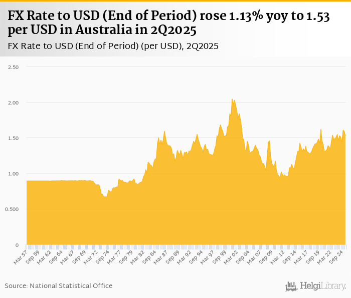 FX rate to USD at the end of period rose 1.13% yoy to 1.53 per USD in Australia in 2Q2025, according to the National Statistical Office. This is 4.12% less than in the previous quarter.