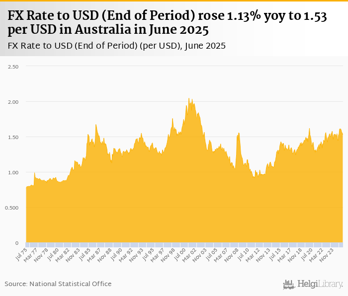 FX rate to USD at the end of period rose 1.13% yoy to 1.53 per USD in Australia in June 2025, according to the National Statistical Office. This is 1.74% less than in the previous month.