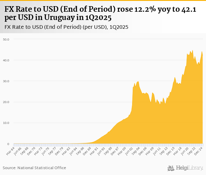 FX rate to USD at the end of period rose 12.2% yoy to 42.1 per USD in Uruguay in 1Q2025, according to the National Statistical Office. This is 4.40% less than in the previous quarter.