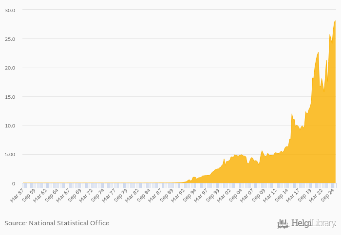 Historically, FX rate to USD at the end of period in Zambia reached an all time high of 28.1 per USD in 1Q2025 and an all time low of < 0.001 per USD in 1Q1974.