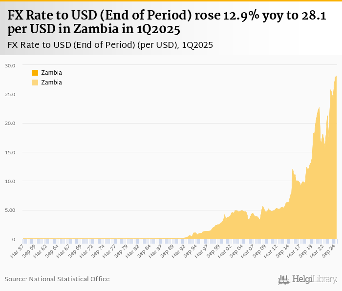 FX Rate to USD (End of Period) rose 12.9% yoy to 28.1 per USD in Zambia in 1Q2025
