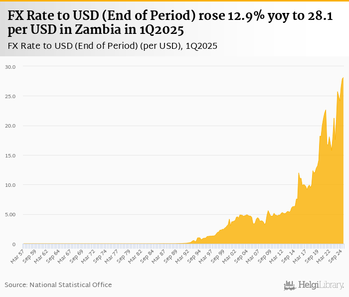 FX rate to USD at the end of period rose 12.9% yoy to 28.1 per USD in Zambia in 1Q2025, according to the National Statistical Office. This is 0.825% more than in the previous quarter.