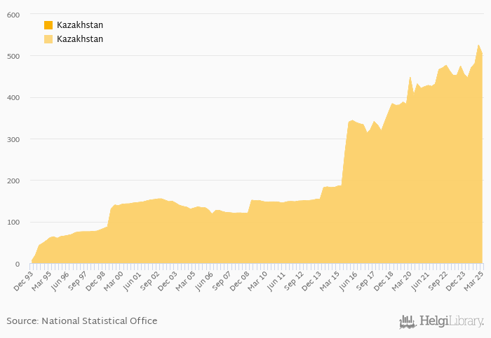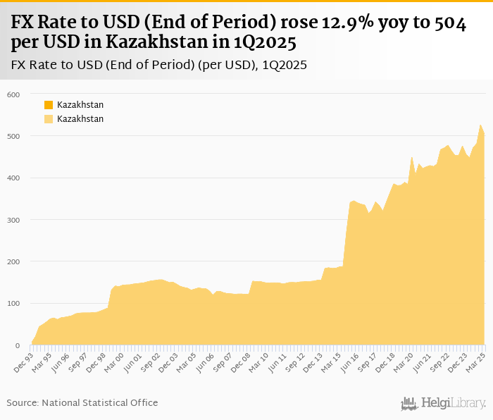 FX rate to USD at the end of period rose 12.9% yoy to 504 per USD in Kazakhstan in 1Q2025, according to the National Statistical Office. This is 3.94% less than in the previous quarter.