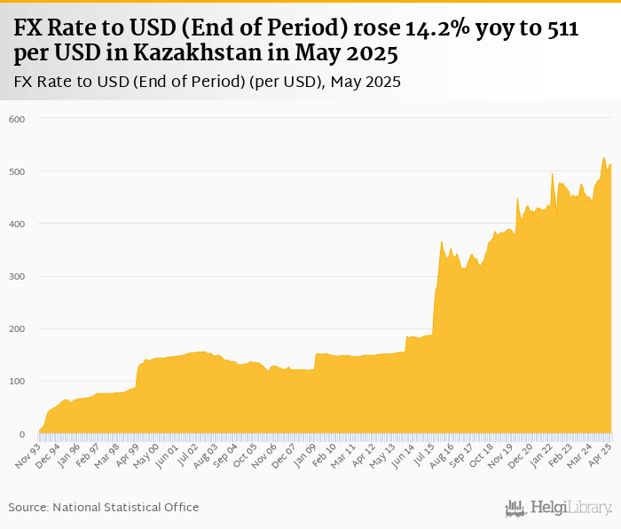 FX rate to USD at the end of period rose 14.2% yoy to 511 per USD in Kazakhstan in May 2025, according to the National Statistical Office. This is 0.299% less than in the previous month.