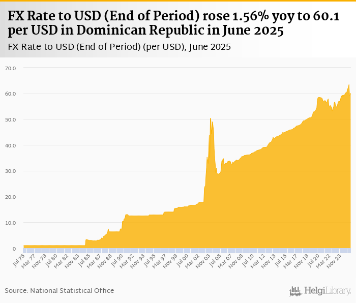 FX rate to USD at the end of period rose 1.56% yoy to 60.1 per USD in Dominican Republic in June 2025, according to the National Statistical Office. This is 1.34% more than in the previous month.