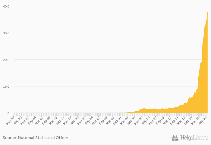 FX rate to USD at the end of period rose 17.0% yoy to 37.8 per USD in Turkey in 1Q2025, according to the National Statistical Office. This is 7.22% more than in the previous quarter.
