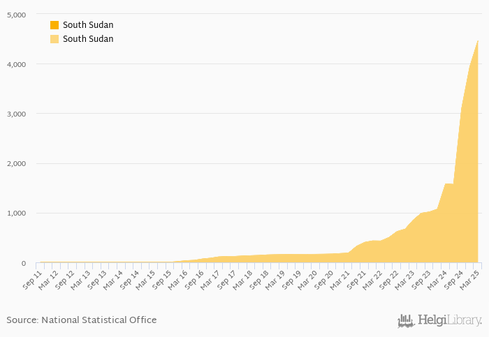 FX rate to USD at the end of period rose 182% yoy to 4,460 per USD in South Sudan in 1Q2025, according to the National Statistical Office. This is 13.2% more than in the previous quarter.