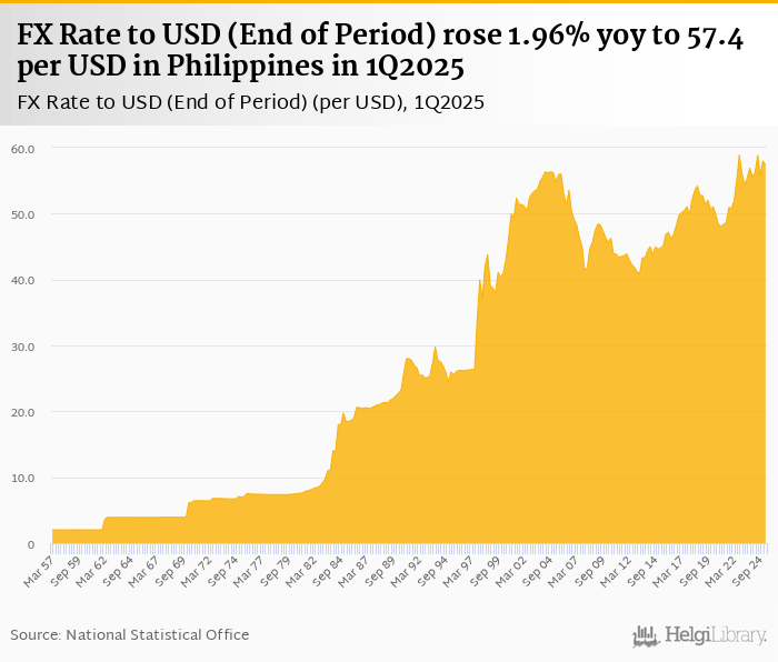 FX rate to USD at the end of period rose 1.96% yoy to 57.4 per USD in Philippines in 1Q2025, according to the National Statistical Office. This is 1.09% less than in the previous quarter.