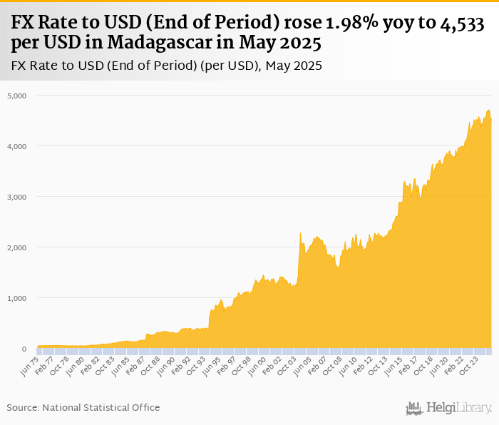 FX rate to USD at the end of period rose 1.98% yoy to 4,533 per USD in Madagascar in May 2025, according to the National Statistical Office. This is 1.54% more than in the previous month.