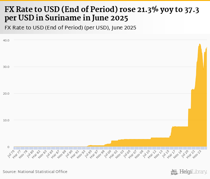 FX rate to USD at the end of period rose 21.3% yoy to 37.3 per USD in Suriname in June 2025, according to the National Statistical Office. This is 2.24% more than in the previous month.