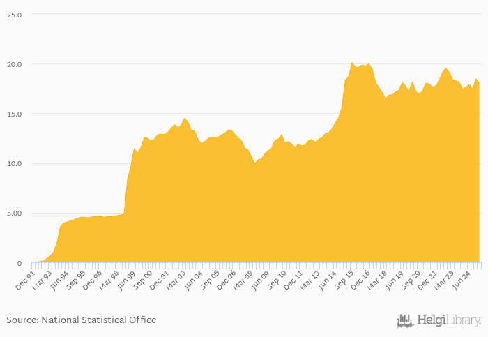 FX rate to USD at the end of period rose 2.29% yoy to 18.0 per USD in Moldova in 1Q2025, according to the National Statistical Office. This is 2.33% less than in the previous quarter.
