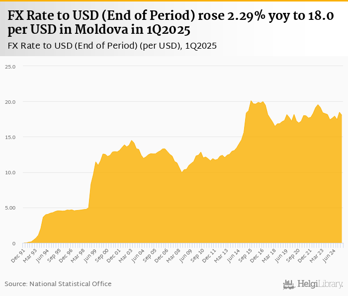 FX rate to USD at the end of period rose 2.29% yoy to 18.0 per USD in Moldova in 1Q2025, according to the National Statistical Office. This is 2.33% less than in the previous quarter.