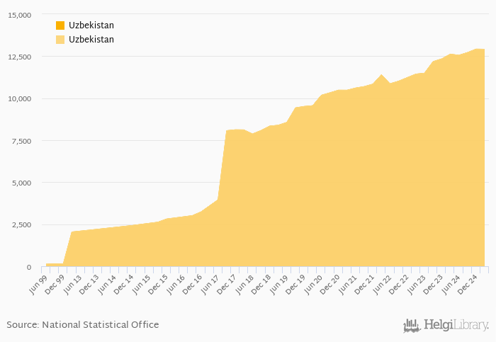 FX rate to USD at the end of period rose 2.32% yoy to 12,913 per USD in Uzbekistan in 1Q2025, according to the National Statistical Office. This is 0.056% less than in the previous quarter.