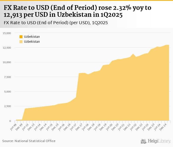 FX Rate to USD (End of Period) rose 2.32% yoy to 12,913 per USD in Uzbekistan in 1Q2025