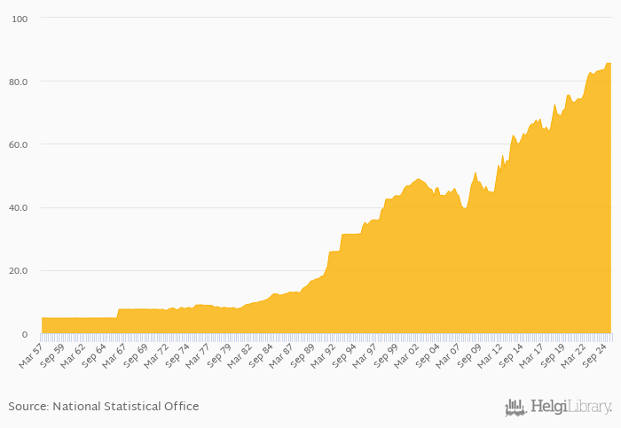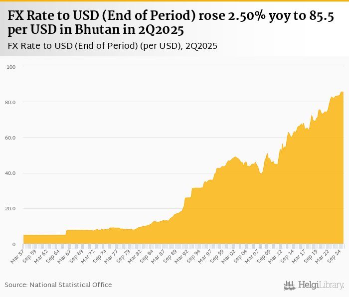 FX rate to USD at the end of period rose 2.50% yoy to 85.5 per USD in Bhutan in 2Q2025, according to the National Statistical Office. This is 0.044% less than in the previous quarter.
