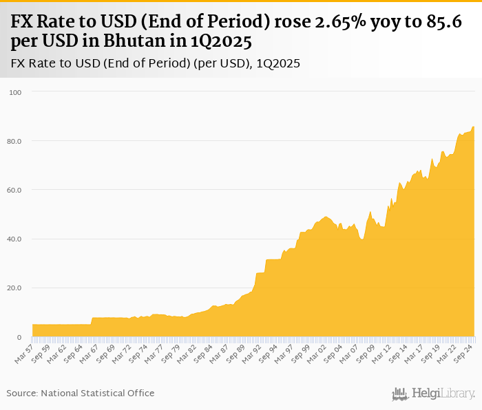 FX rate to USD at the end of period rose 2.65% yoy to 85.6 per USD in Bhutan in 1Q2025, according to the National Statistical Office. This is 0.049% less than in the previous quarter.