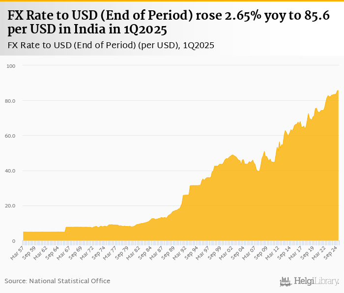 FX rate to USD at the end of period rose 2.65% yoy to 85.6 per USD in India in 1Q2025, according to the National Statistical Office. This is 0.049% less than in the previous quarter.