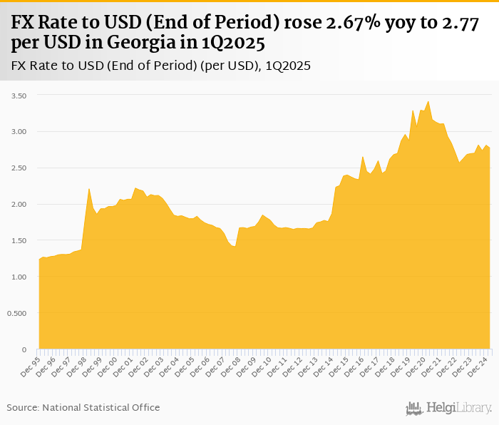 FX Rate to USD (End of Period) rose 2.67% yoy to 2.77 per USD in Georgia in 1Q2025