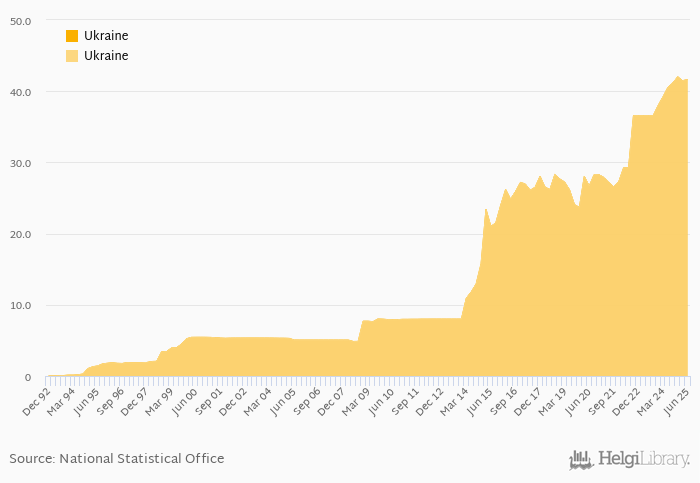 FX rate to USD at the end of period rose 2.72% yoy to 41.6 per USD in Ukraine in 2Q2025, according to the National Statistical Office. This is 0.391% more than in the previous quarter.