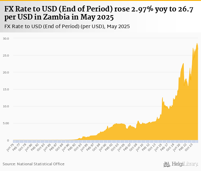 FX rate to USD at the end of period rose 2.97% yoy to 26.7 per USD in Zambia in May 2025, according to the National Statistical Office. This is 4.57% less than in the previous month.