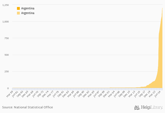 Historically, FX rate to USD at the end of period in Argentina reached an all time high of 1,201 per USD in 2Q2025 and an all time low of < 0.001 per USD in 1Q1959.
