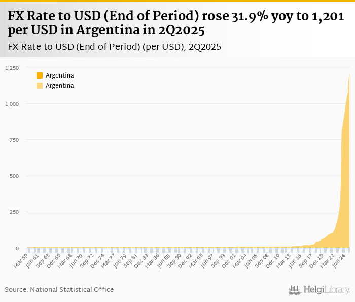FX rate to USD at the end of period rose 31.9% yoy to 1,201 per USD in Argentina in 2Q2025, according to the National Statistical Office. This is 11.9% more than in the previous quarter.