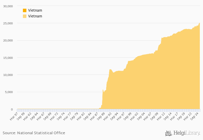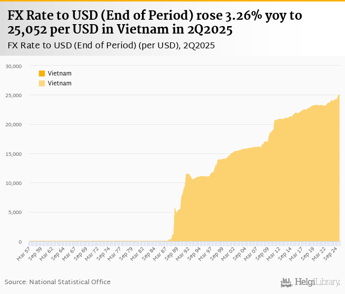 FX rate to USD at the end of period rose 3.26% yoy to 25,052 per USD in Vietnam in 2Q2025, according to the National Statistical Office. This is 0.866% more than in the previous quarter.