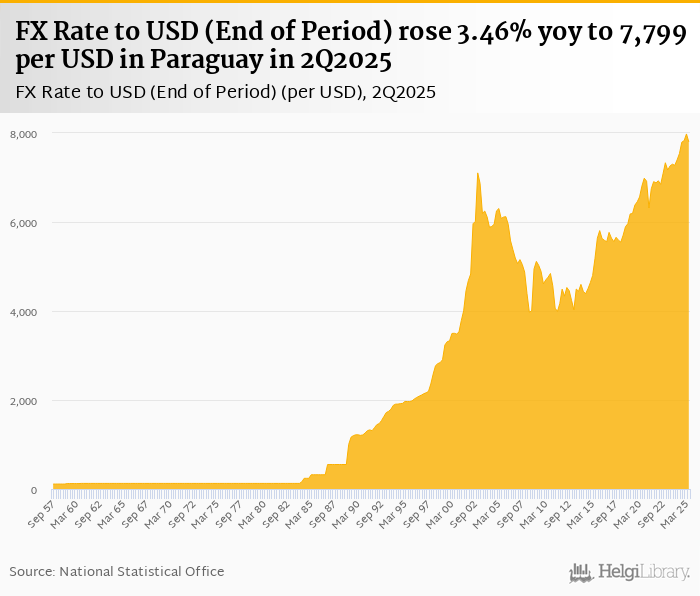 FX rate to USD at the end of period rose 3.46% yoy to 7,799 per USD in Paraguay in 2Q2025, according to the National Statistical Office. This is 2.25% less than in the previous quarter.