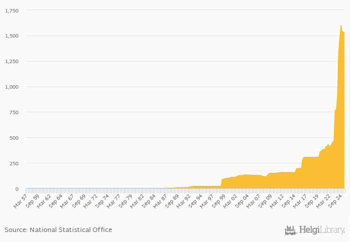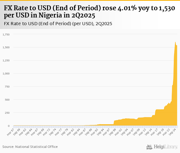FX rate to USD at the end of period rose 4.01% yoy to 1,530 per USD in Nigeria in 2Q2025, according to the National Statistical Office. This is 0.463% less than in the previous quarter.