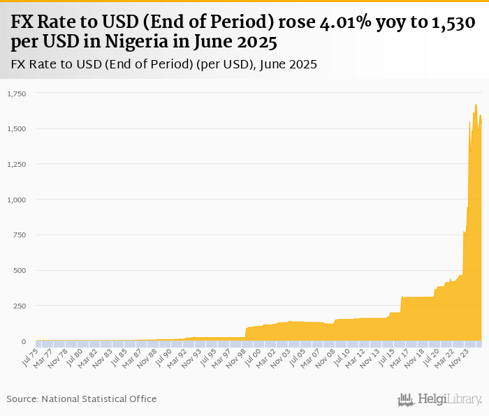 FX rate to USD at the end of period rose 4.01% yoy to 1,530 per USD in Nigeria in June 2025, according to the National Statistical Office. This is 3.56% less than in the previous month.