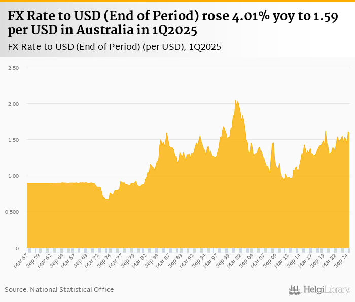 FX rate to USD at the end of period rose 4.01% yoy to 1.59 per USD in Australia in 1Q2025, according to the National Statistical Office. This is 1.00% less than in the previous quarter.